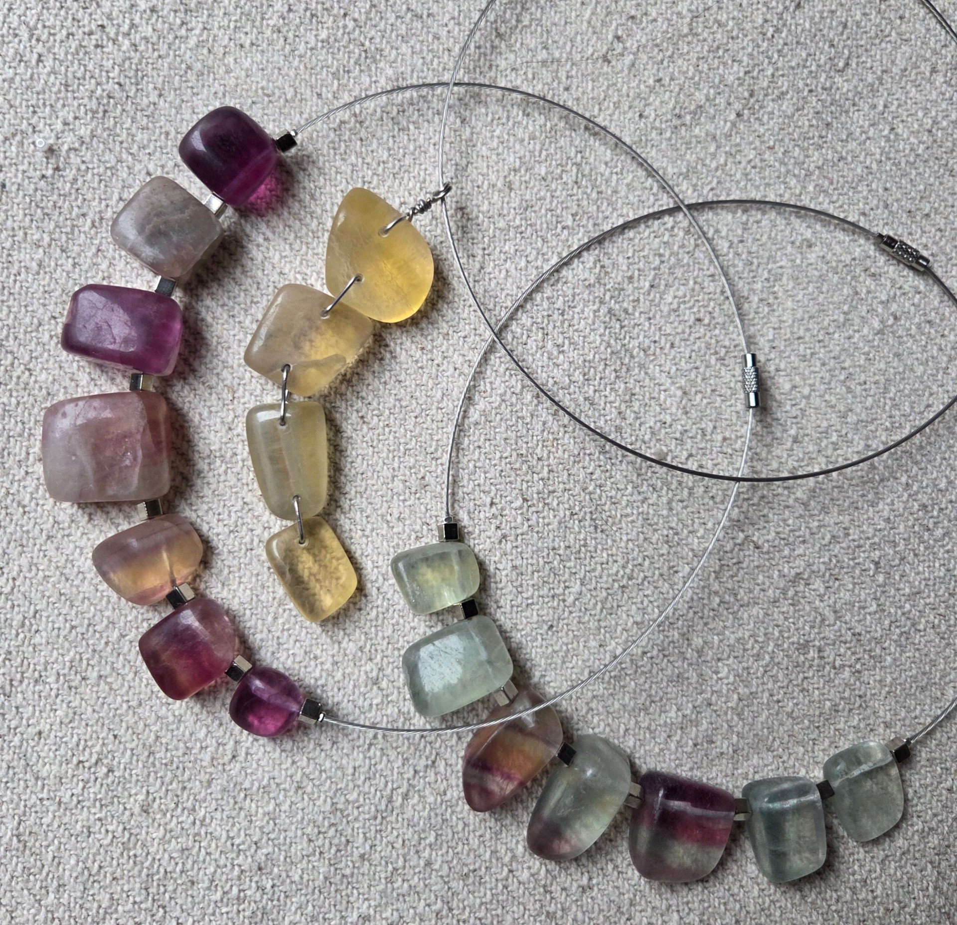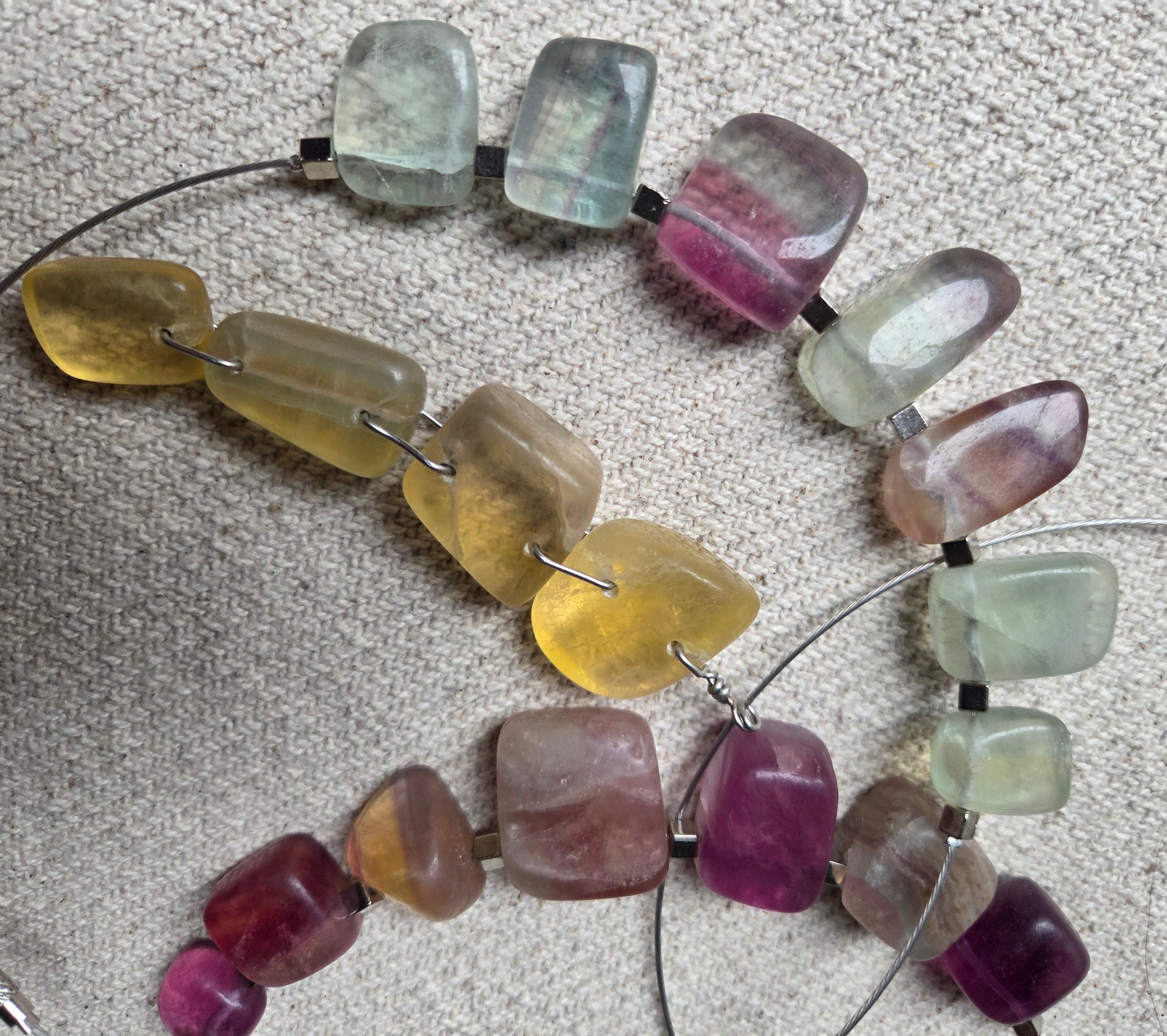 Vidám, gumicukor hatású, gyönyörű kékes, lilás tónusú 1,5-2,5cm nagyságú fluorit szögletes kristályok 7 darab, 46cm sodronyra fűzve.