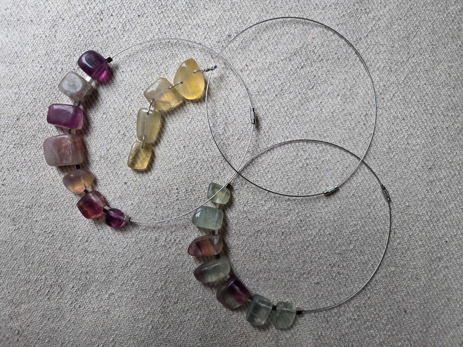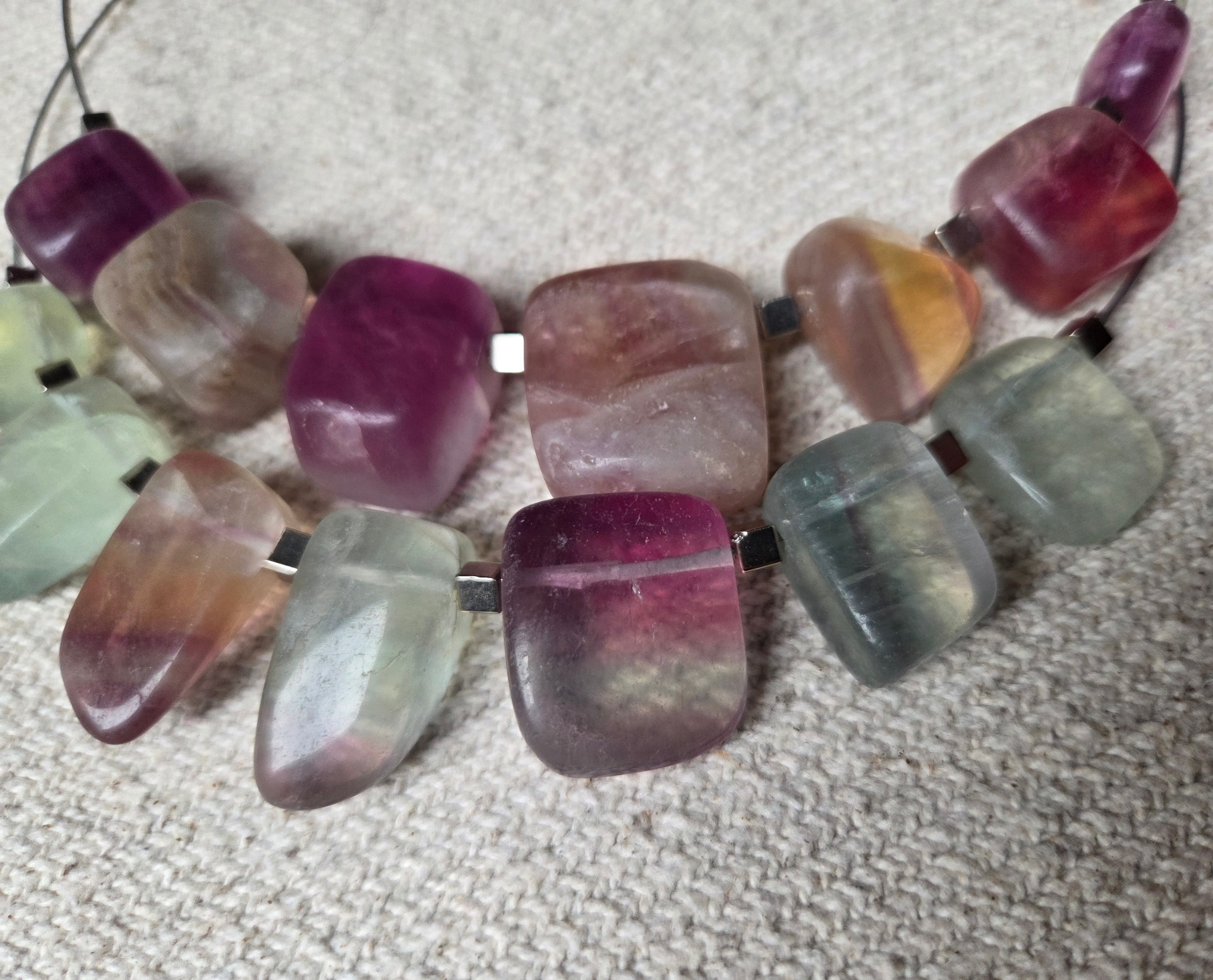 Vidám, gumicukor hatású, gyönyörű, lilás tónusú 1,5-2,5cm nagyságú fluorit szögletes kristályok 7 darab, 46cm sodronyra fűzve.