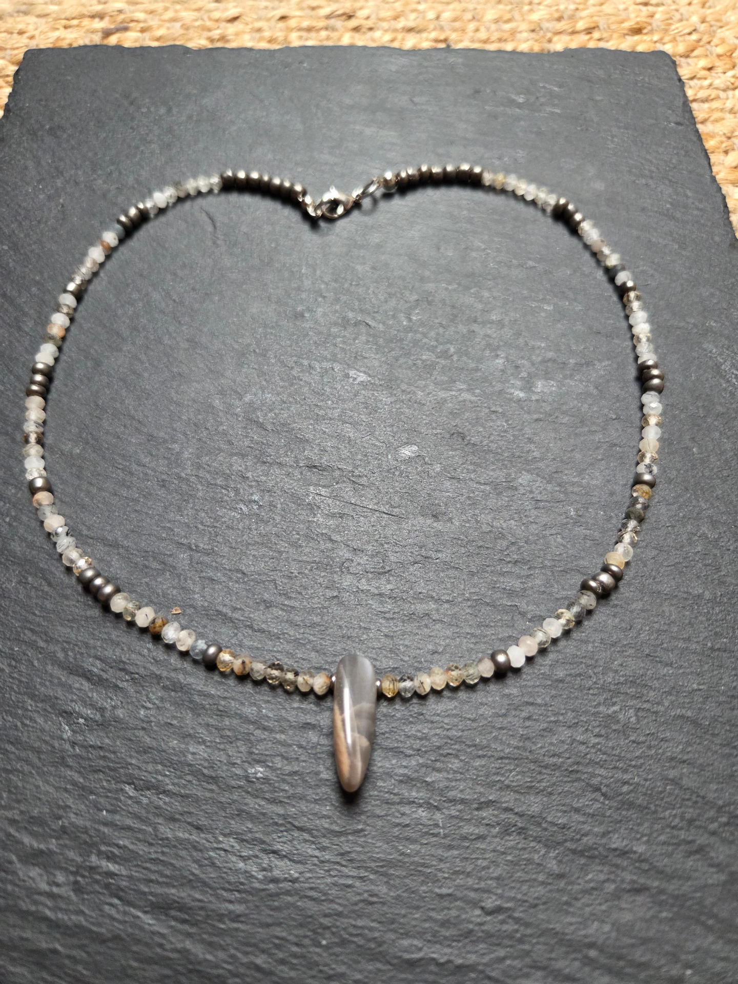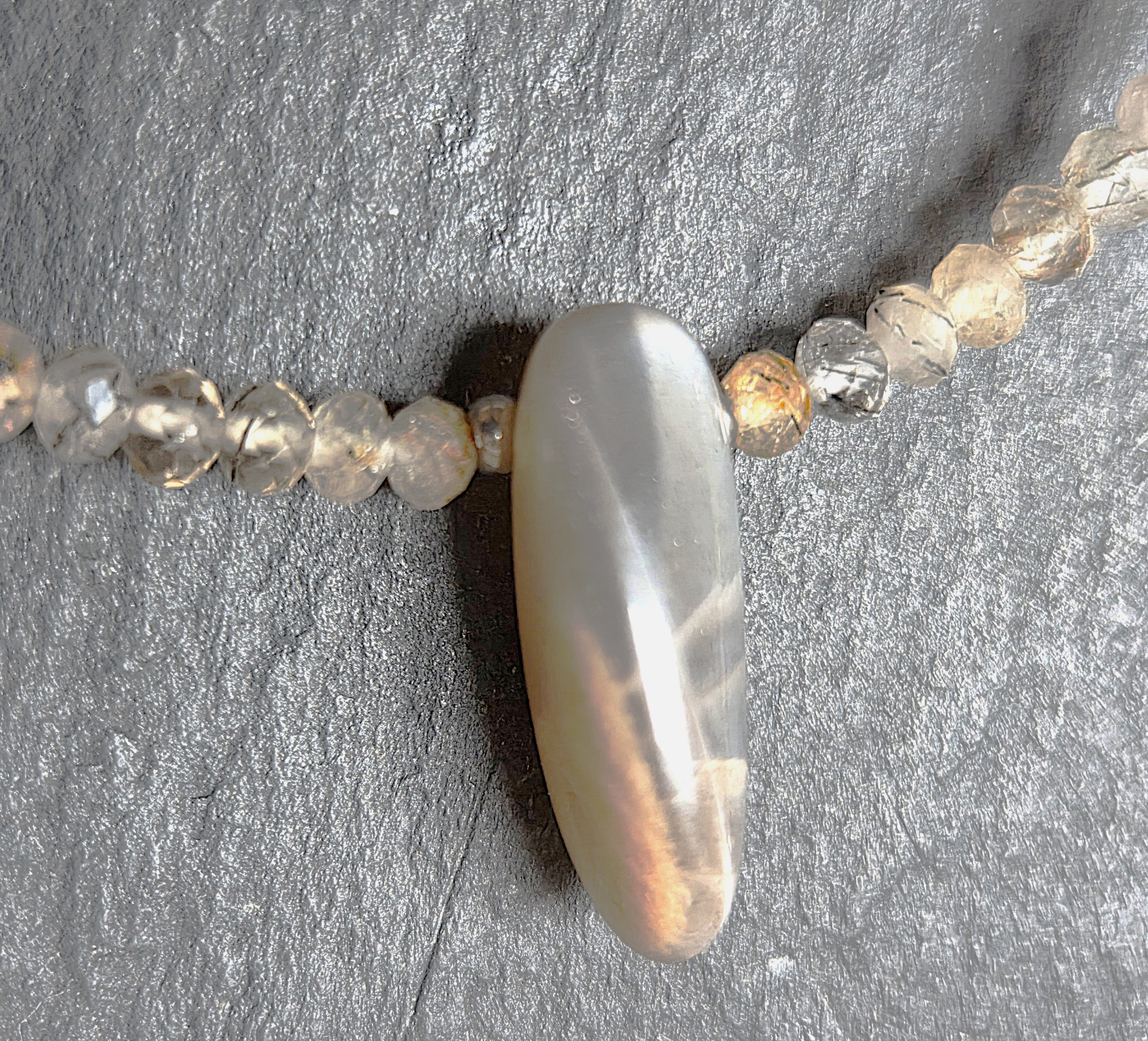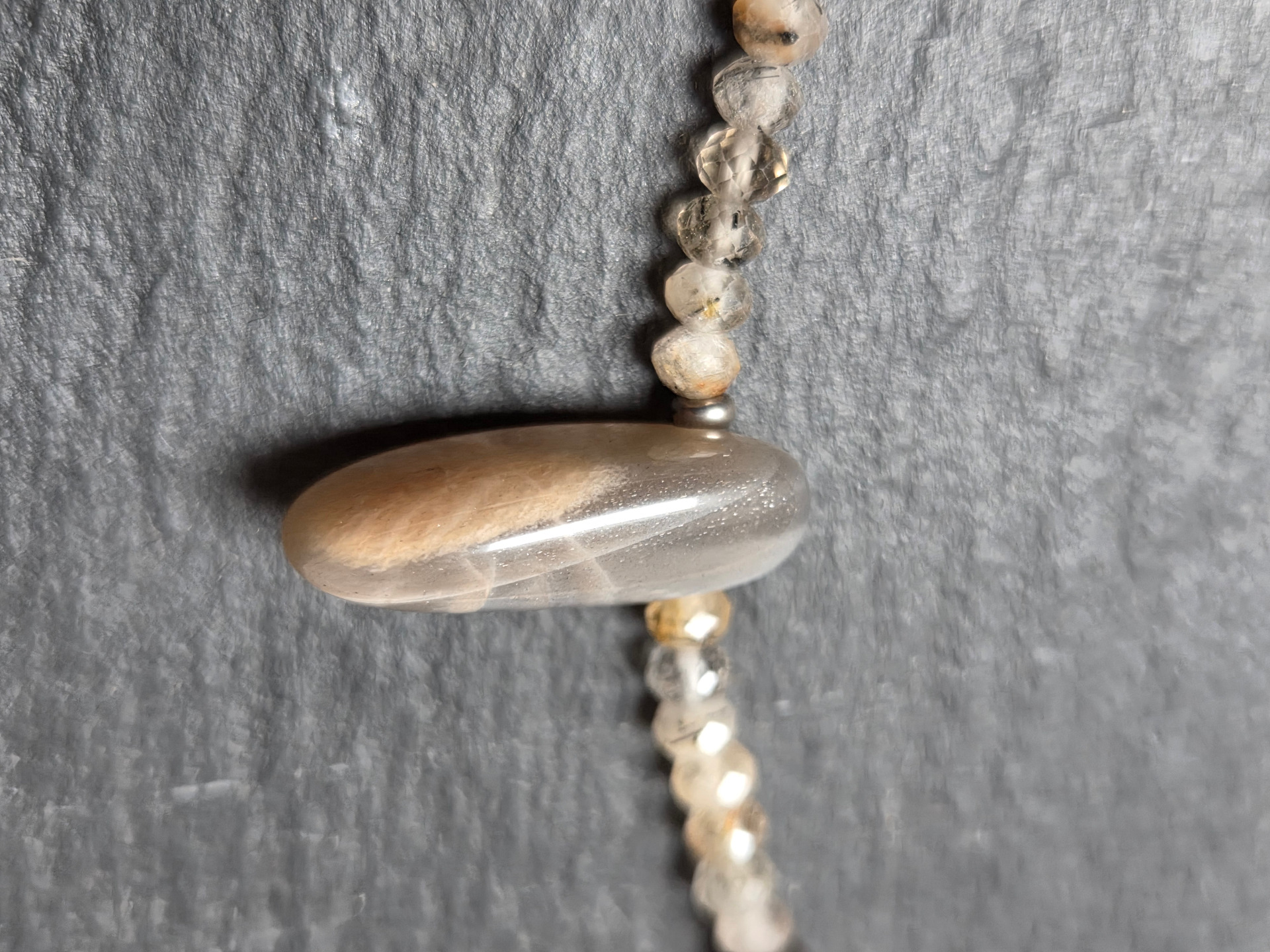 Szaténos fényű szürkés rózsaszín holdkő 22mm, fazettált turmalinkvarc és fémes apró gyöngyökkel fűzve. Hossza 45cm.