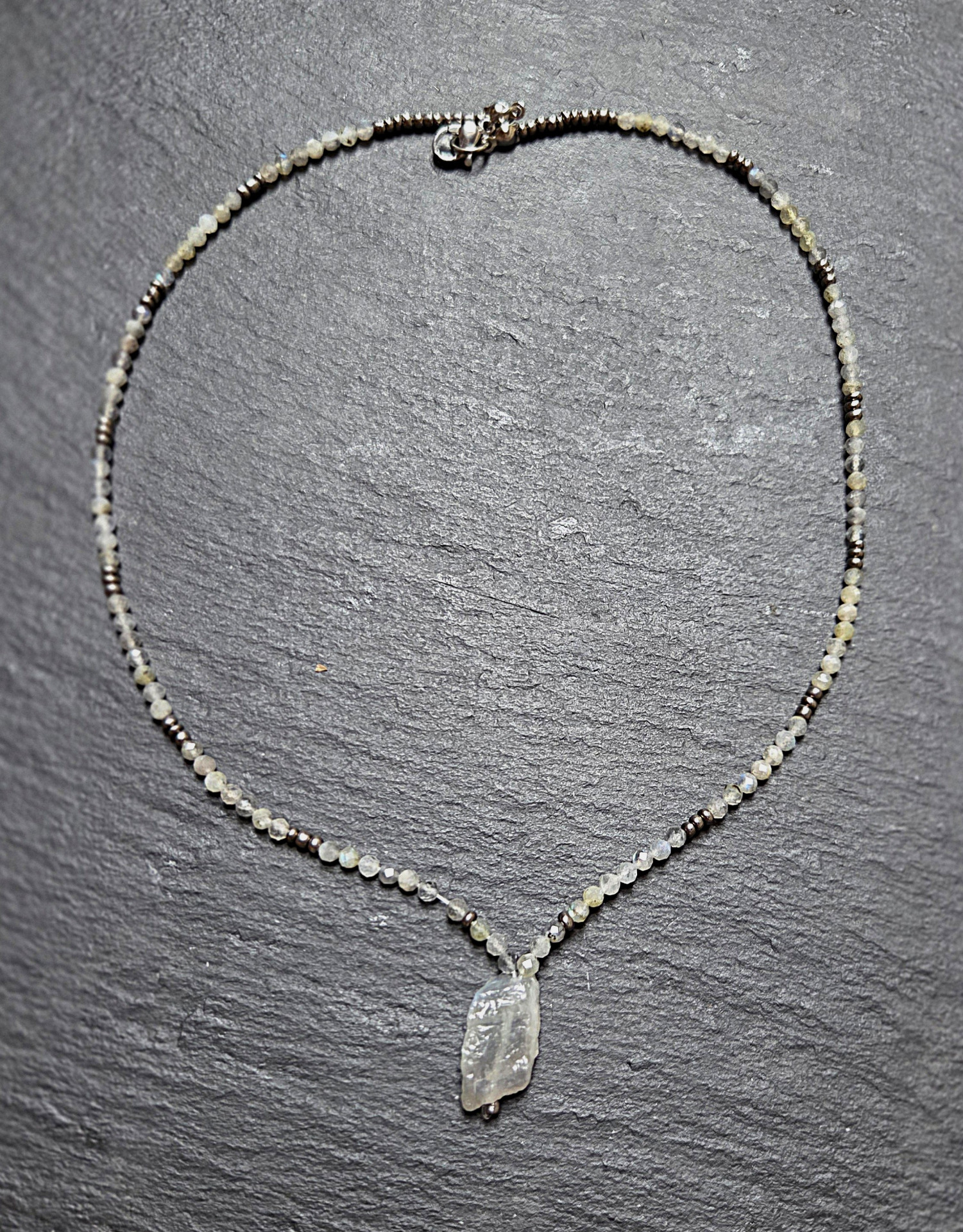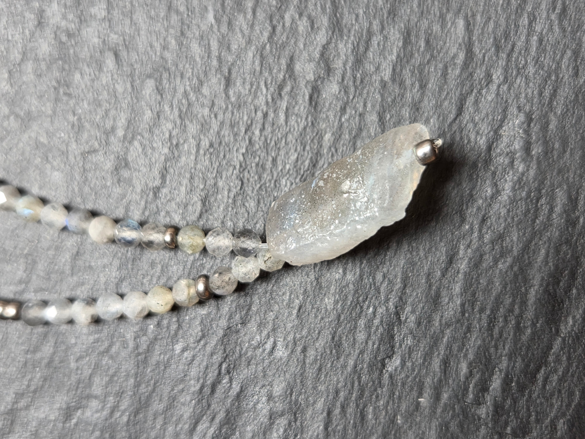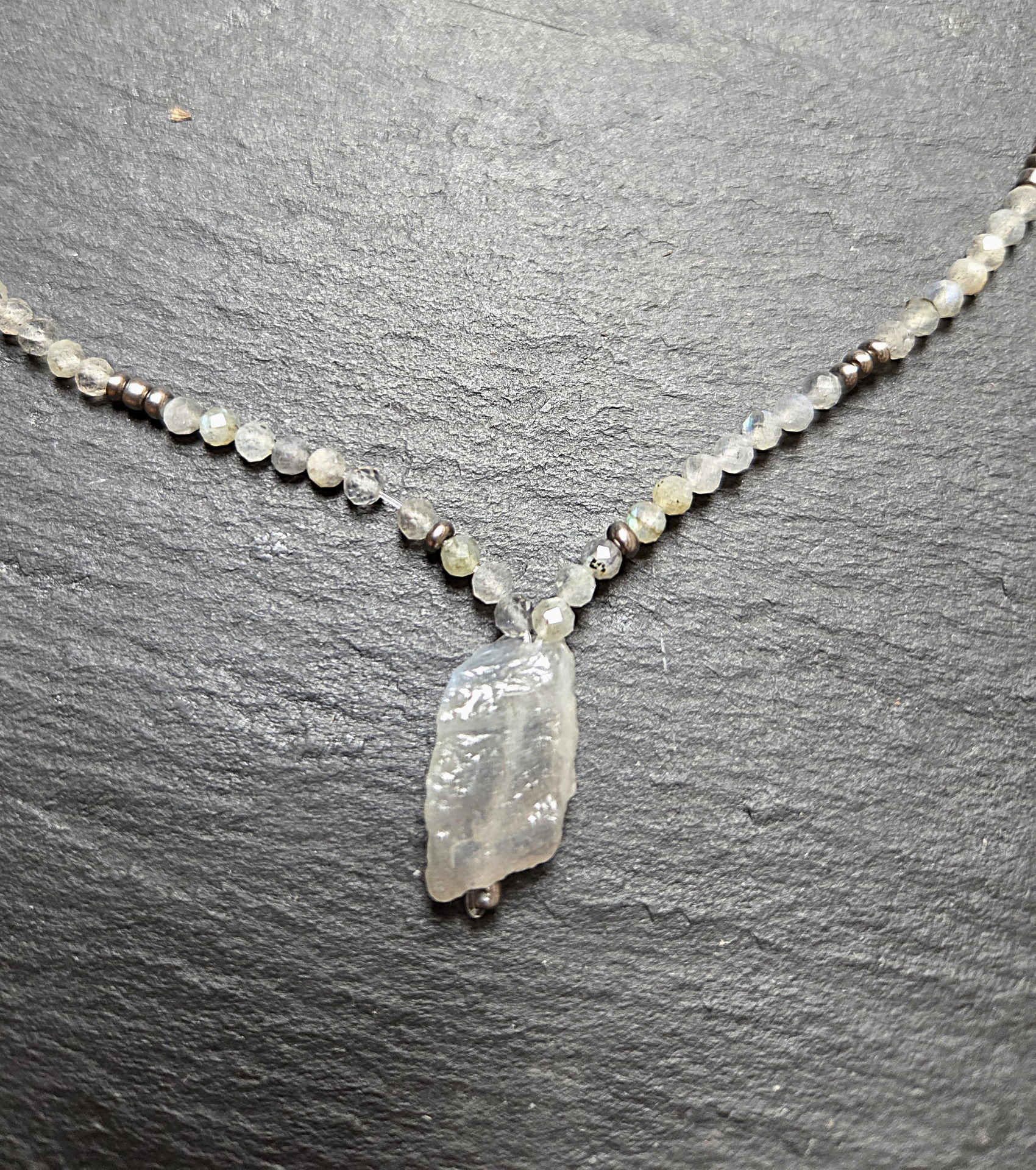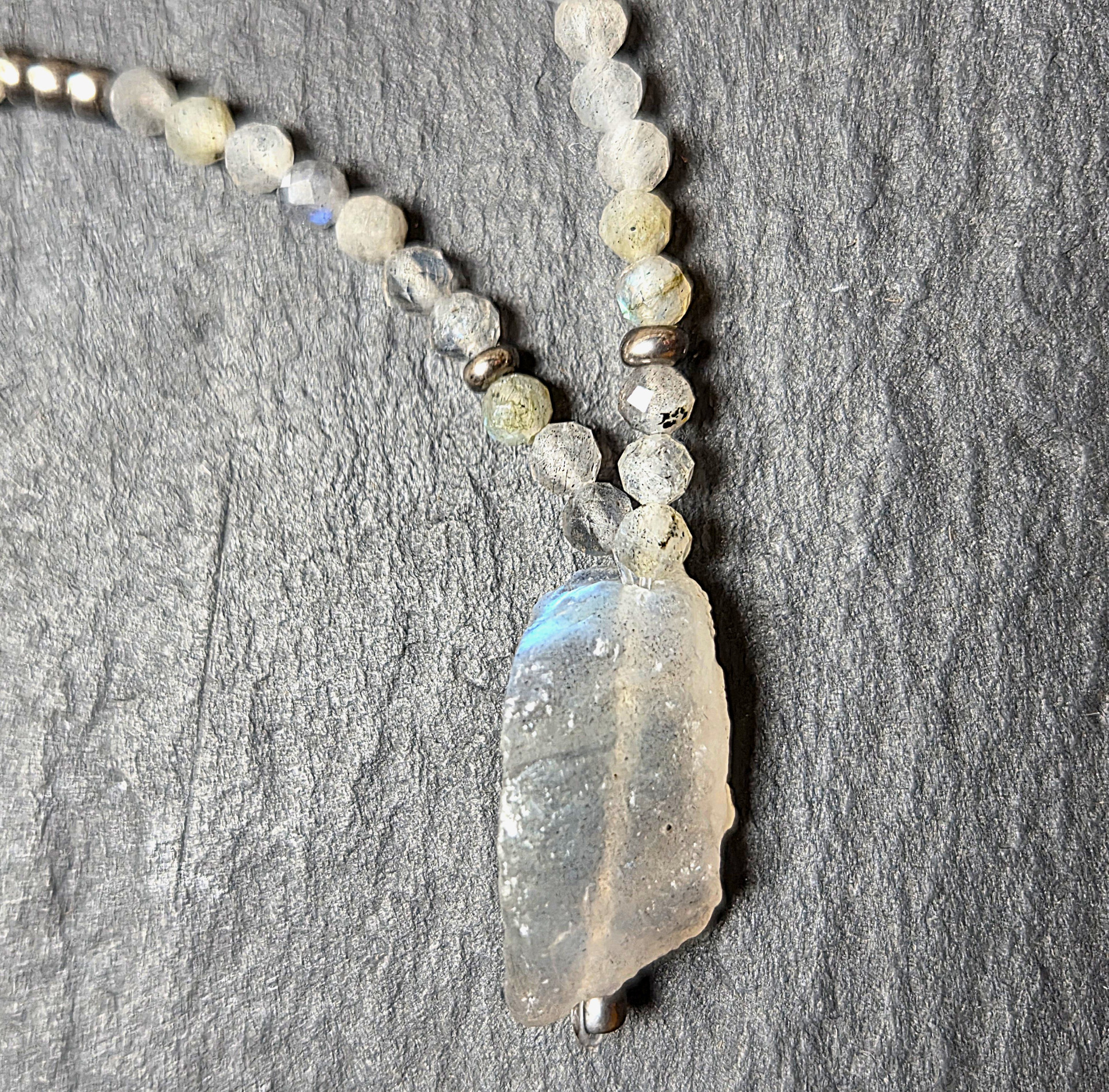 Gyönyörű kékesen színjátszós valódi labradorit kristály 2cm,  apró fazettált labradorit és fémes gyöngyökkel fűzve. Hossza 46cm.
