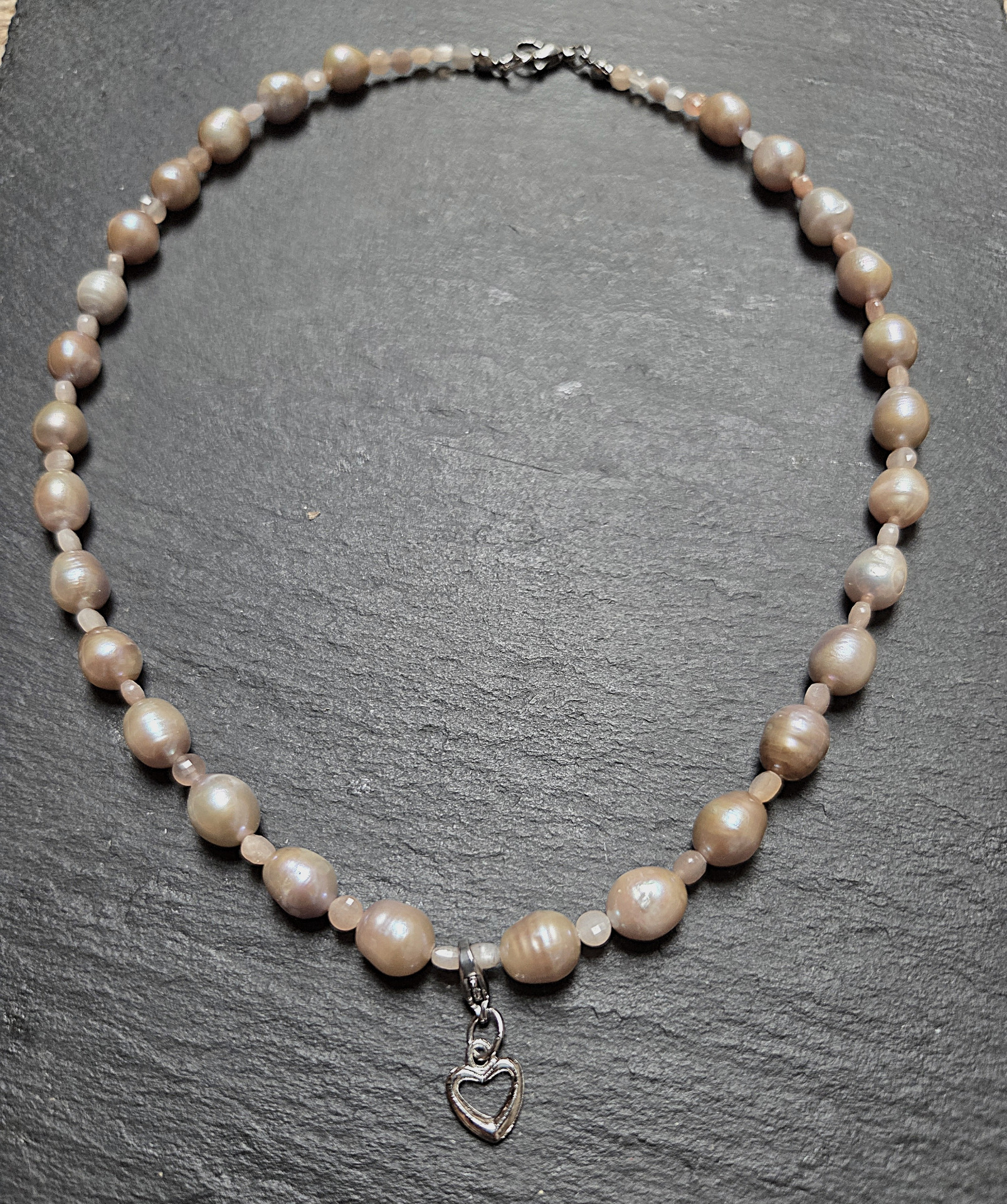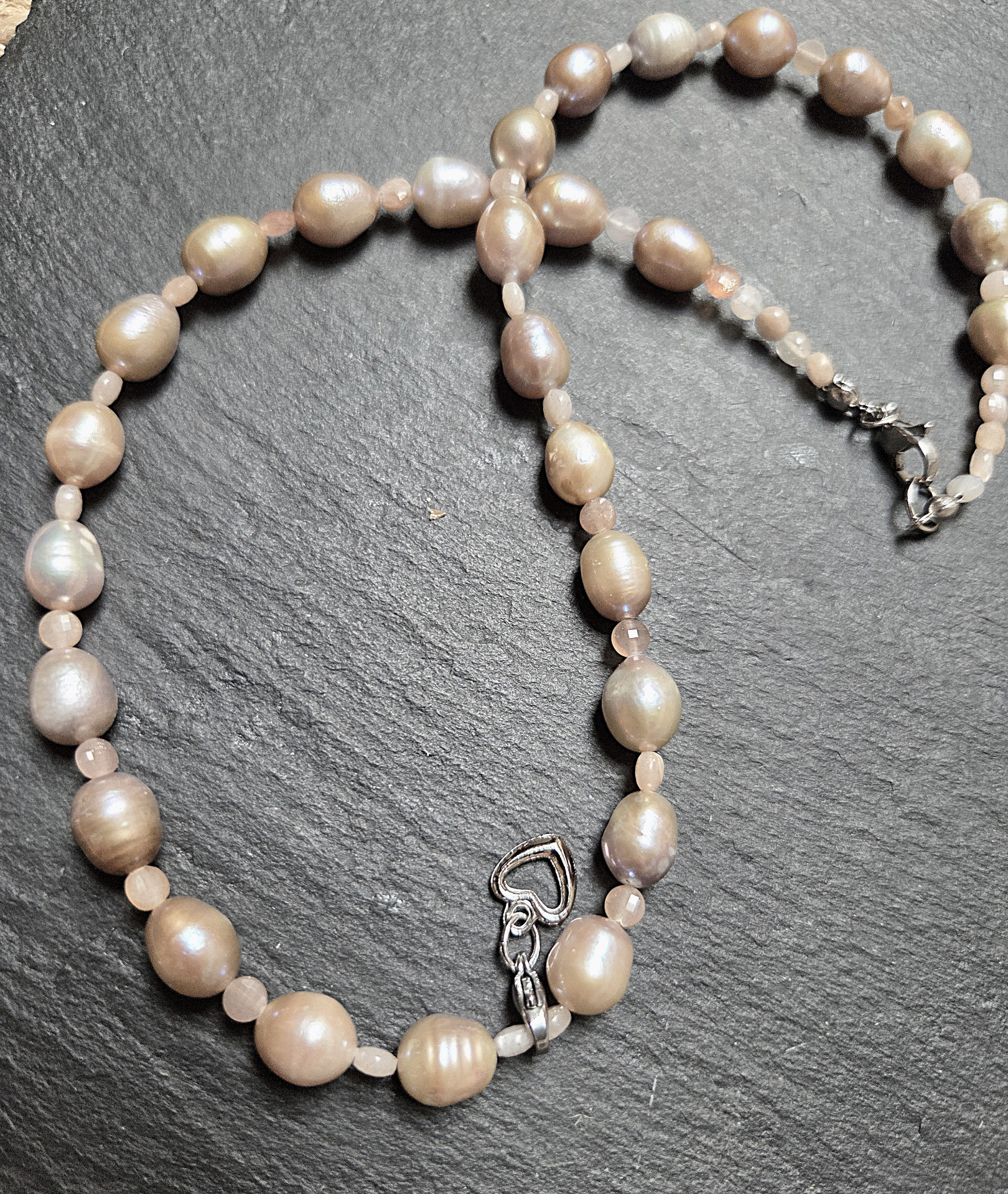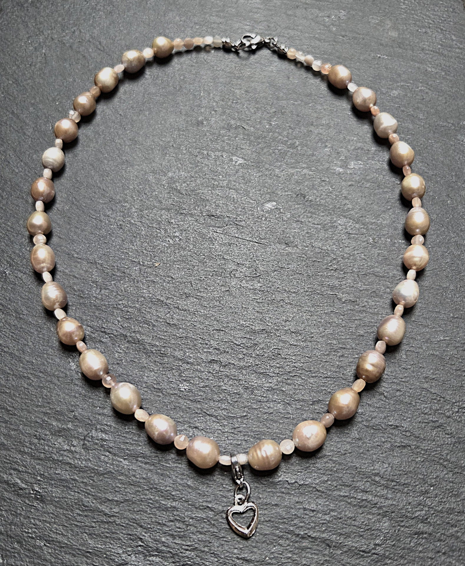 Valódi 8mm púder színű tenyésztett édesvízi barokk gyöngysor, apró fazettált púderszínű cirkon gyöngyökkel fűzve.