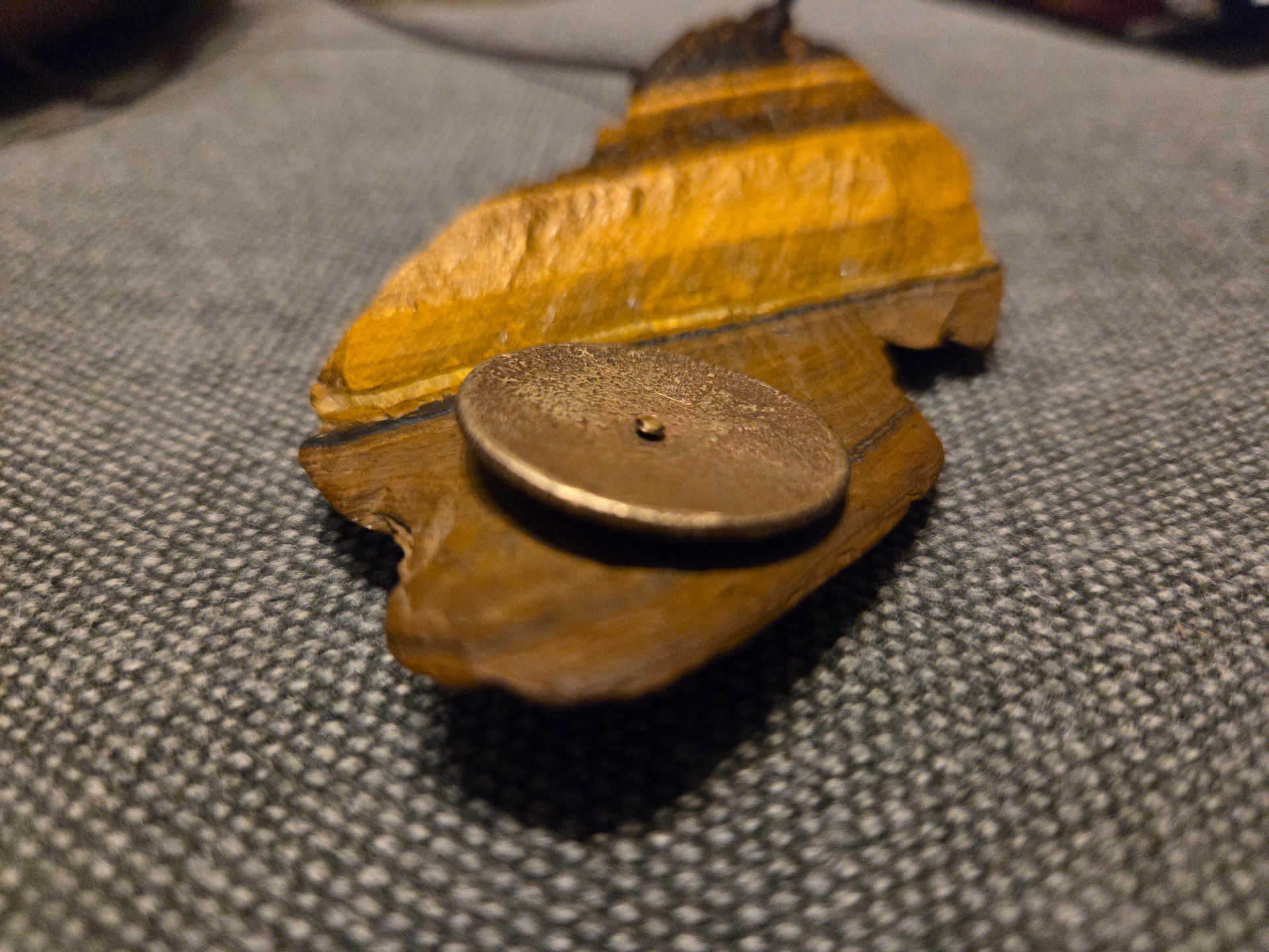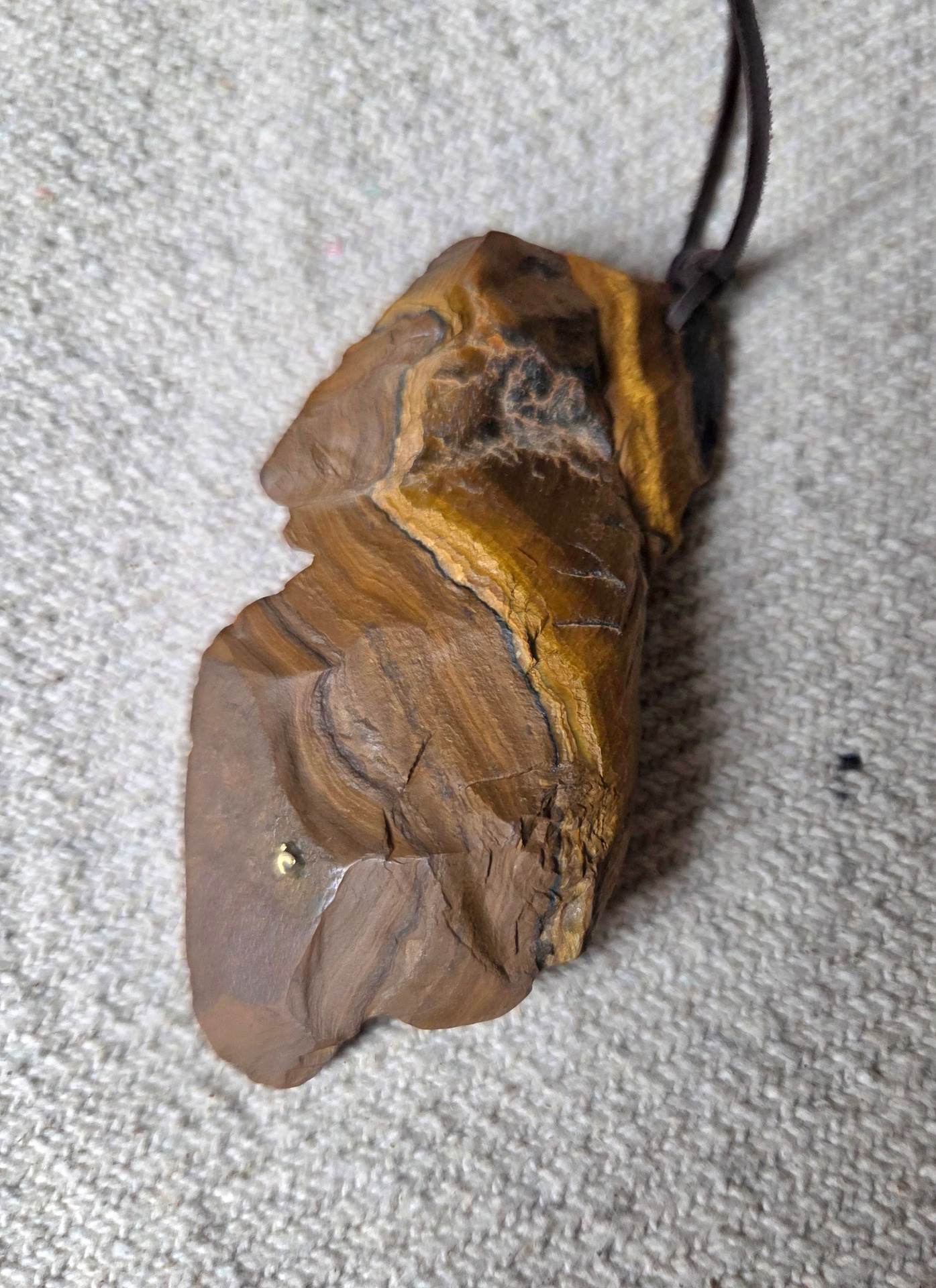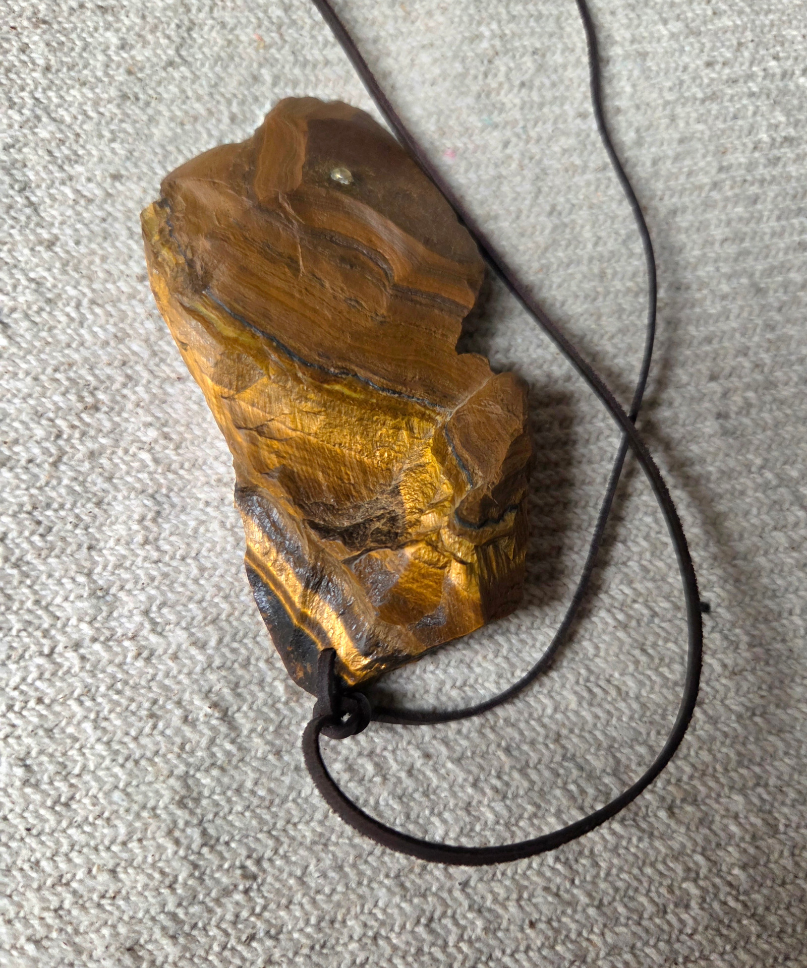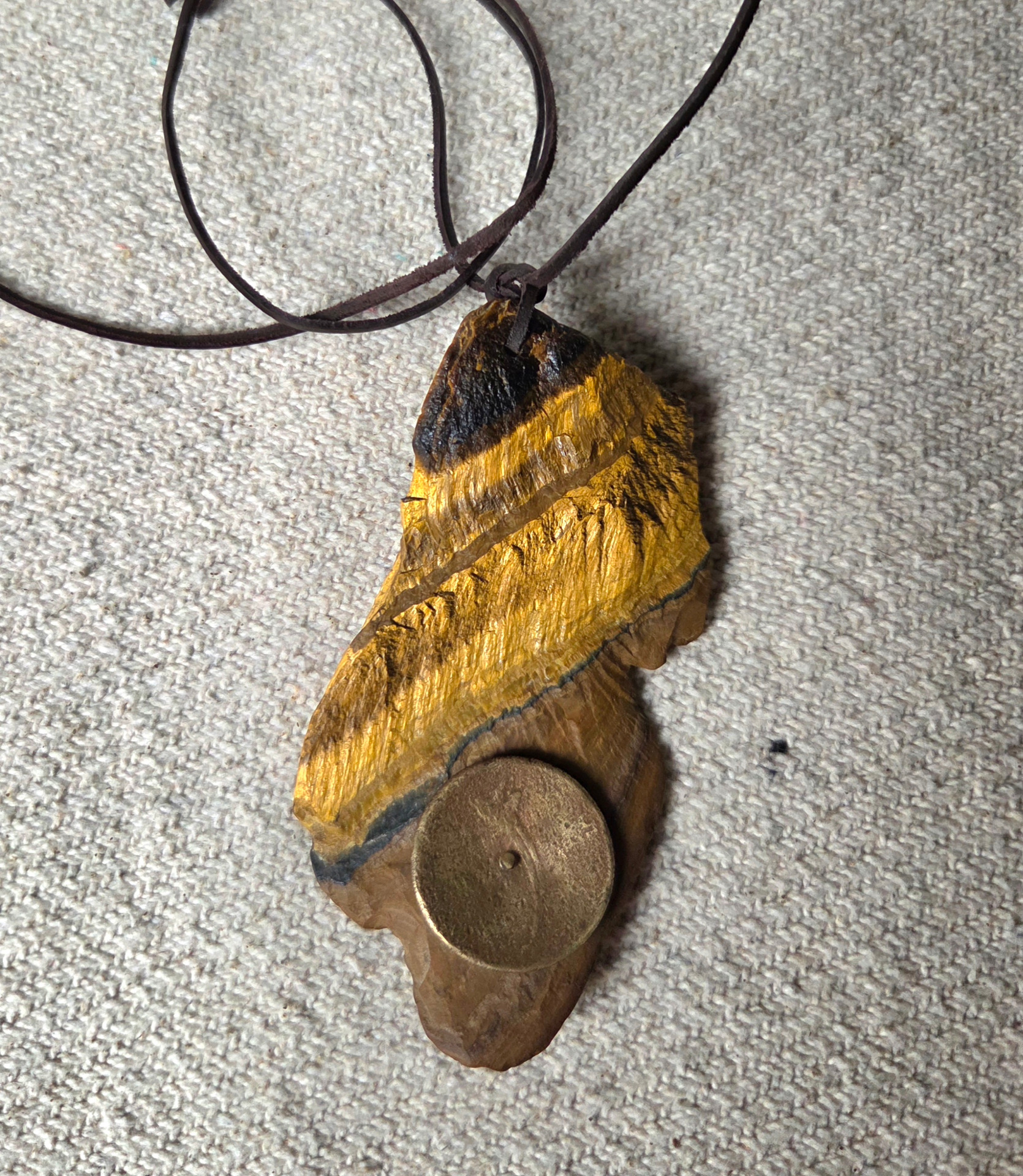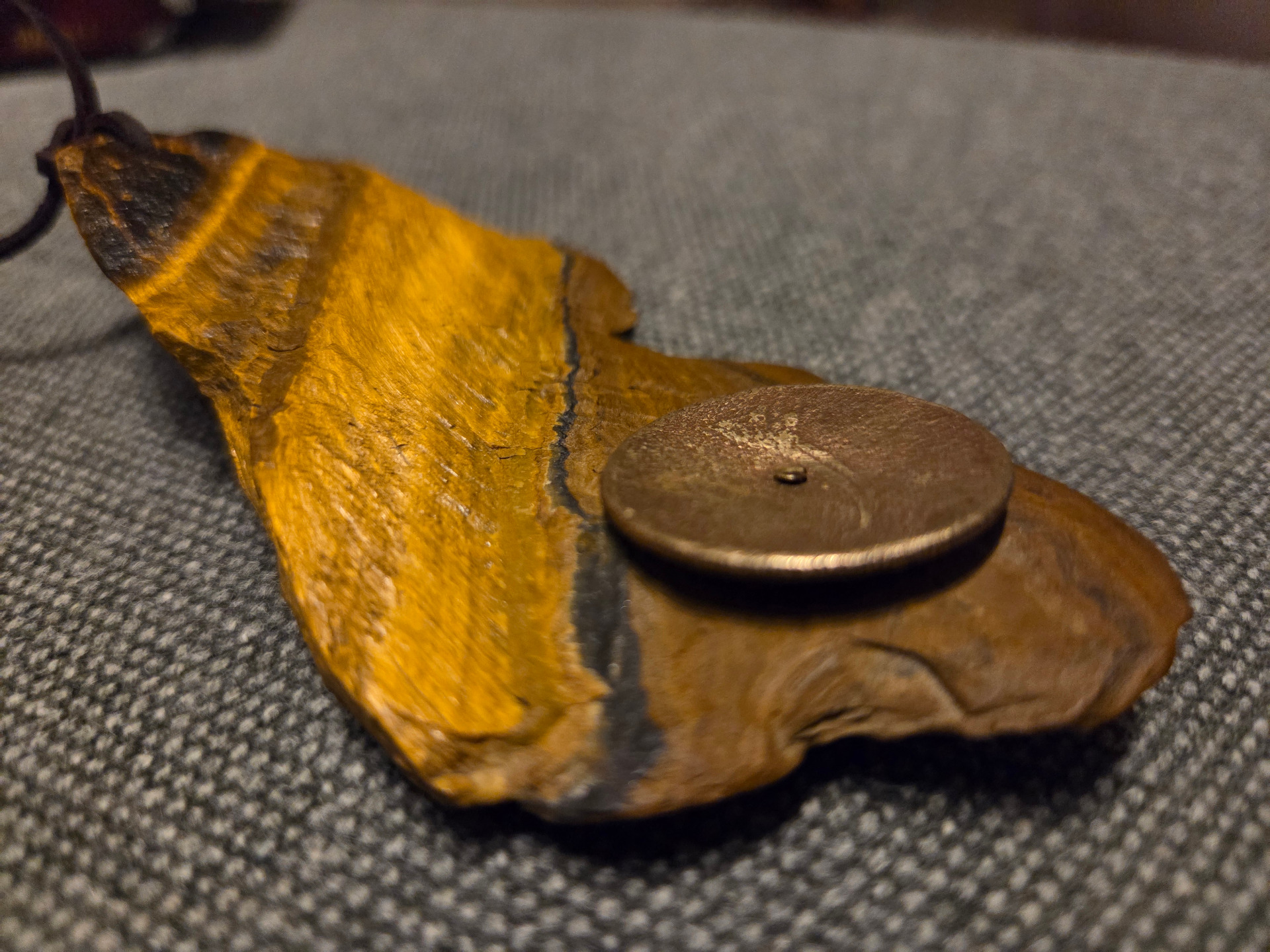 Vidám, játékos, pörgettyűs Tigrisszem nyakék, 10x5cm nyers tigrisszem kő, tengerben eddződött érmével, bőrszálra fűzve
