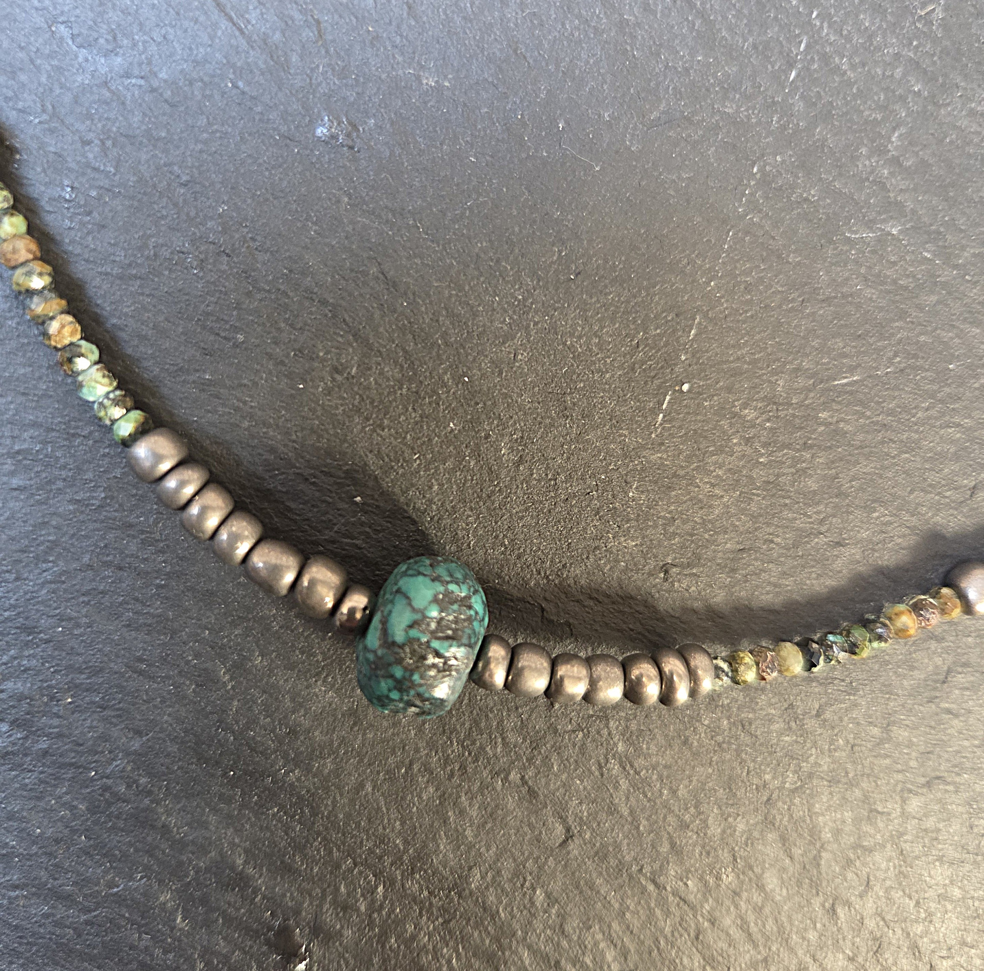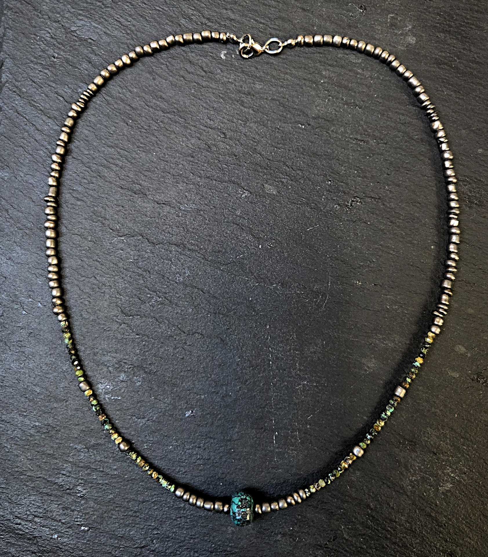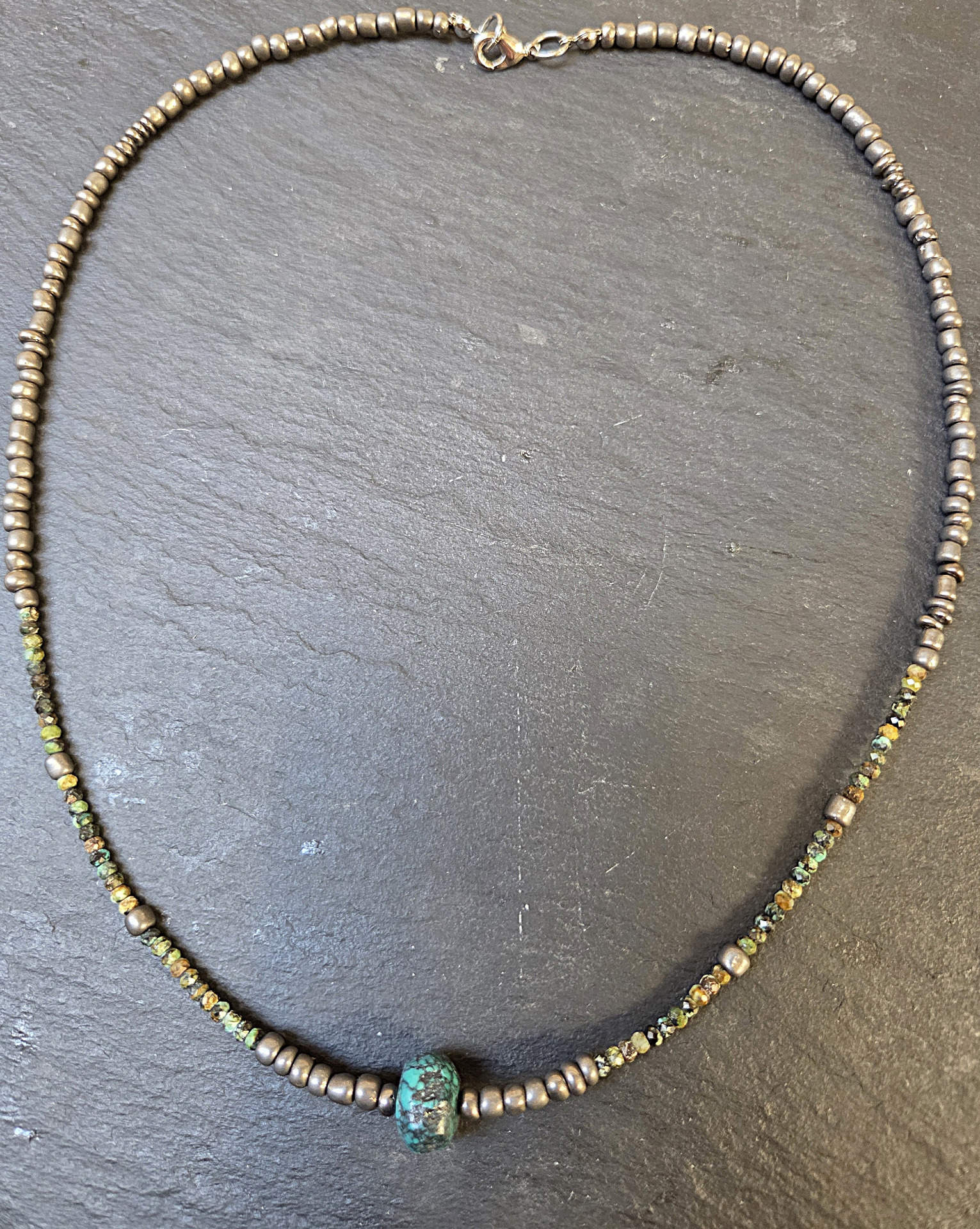 Unisex egyedi nyaklánc, központi türkiz kő, apró fazettált türkiz gyöngyökkel és fémes kásagyöngyel fűzve.