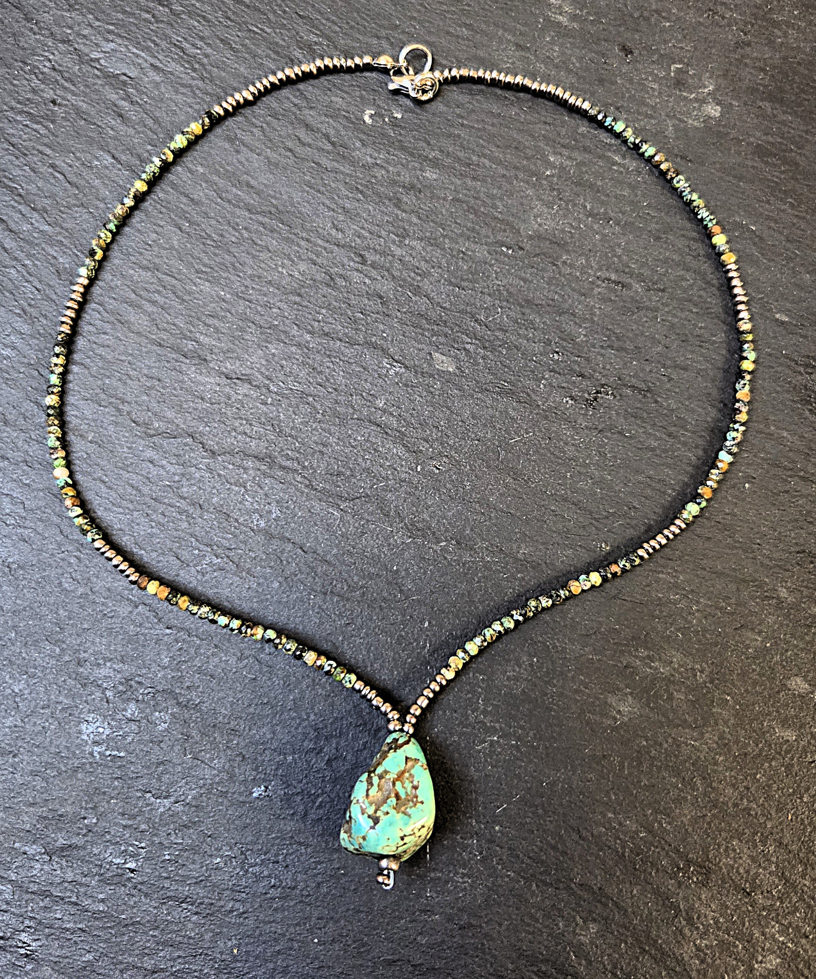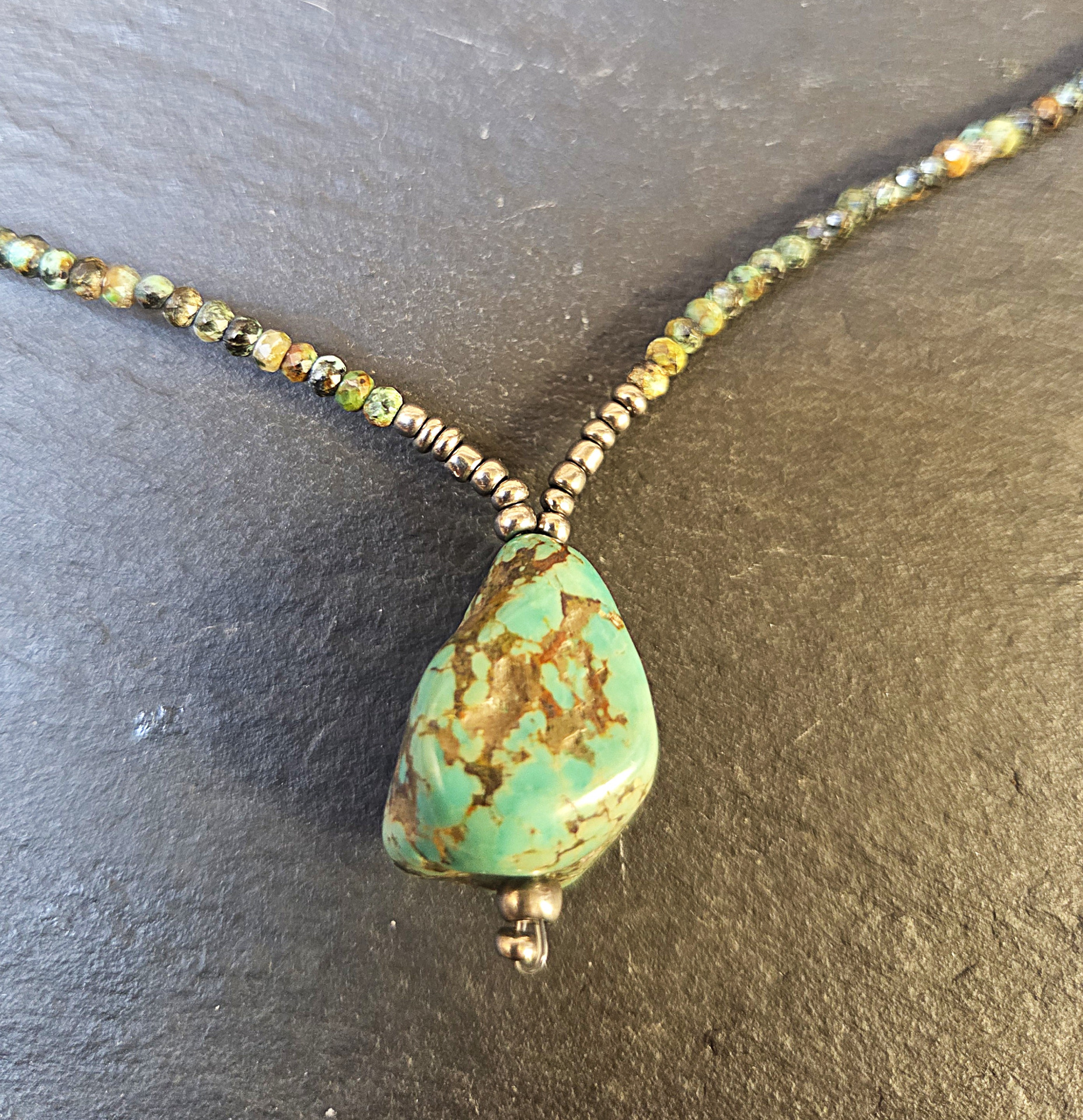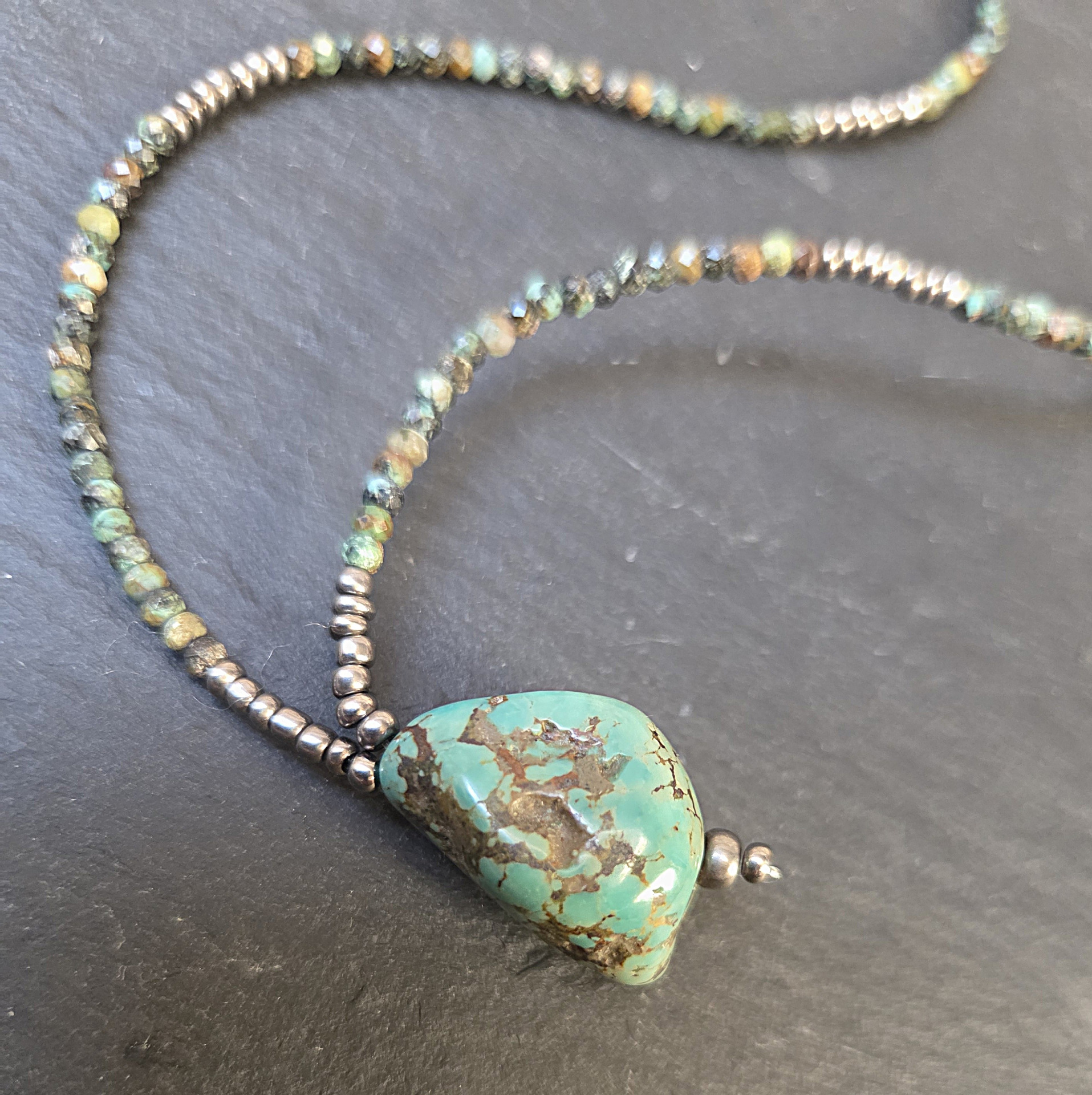 Unisex egyedi nyaklánc, központi türkiz kő, apró fazettált türkiz gyöngyökkel és fémes kásagyöngyel fűzve.