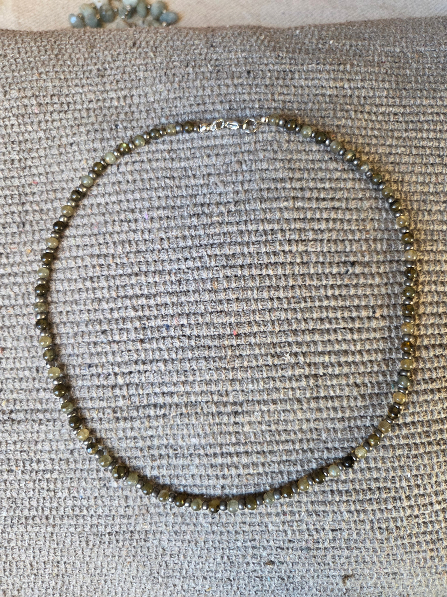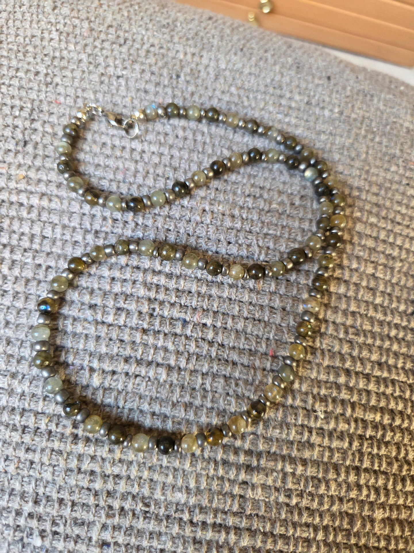Unisex egyedi nyaklánc, labradorit gyöngyök, apró fémes kásagyöngyel fűzve.