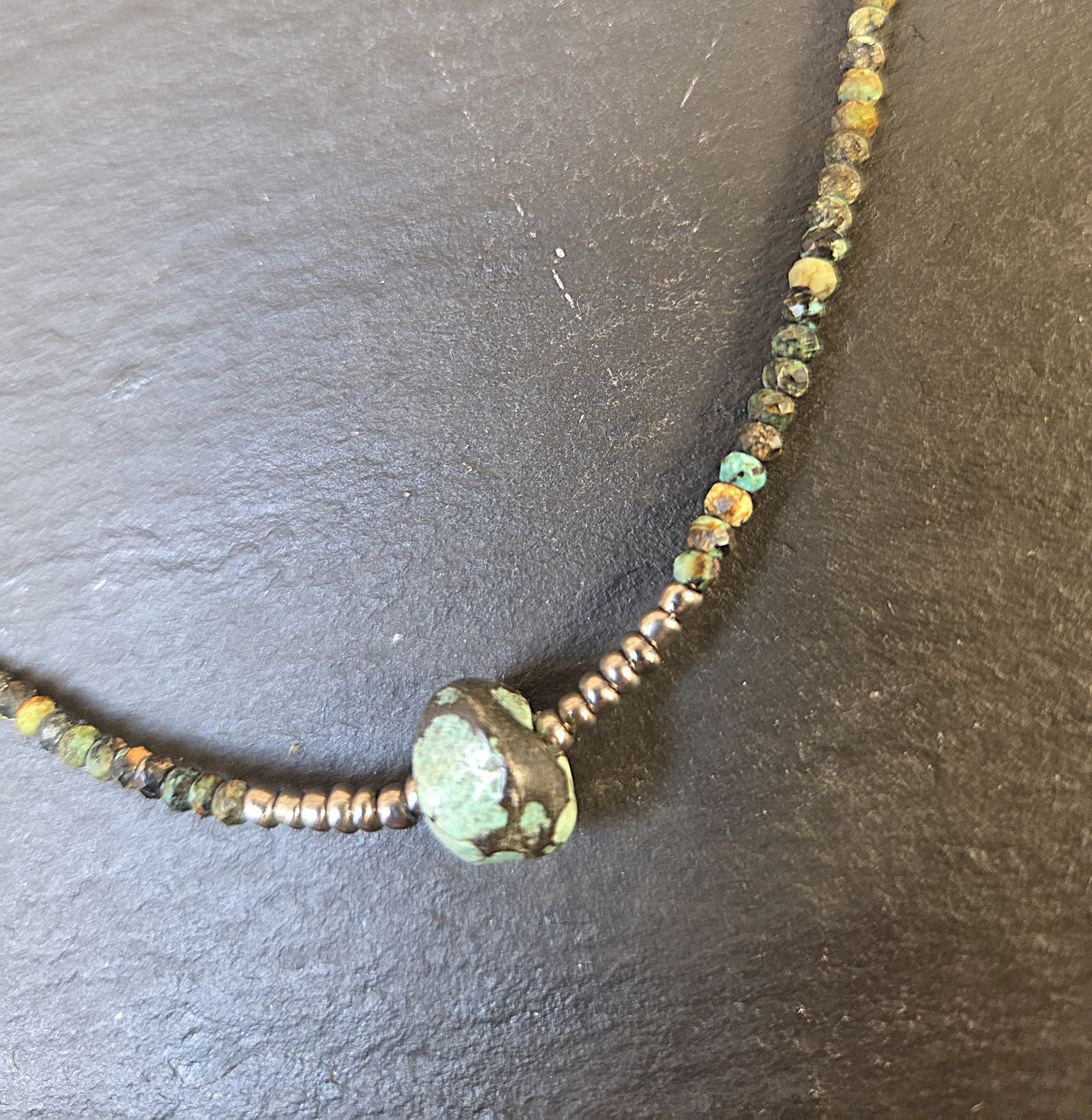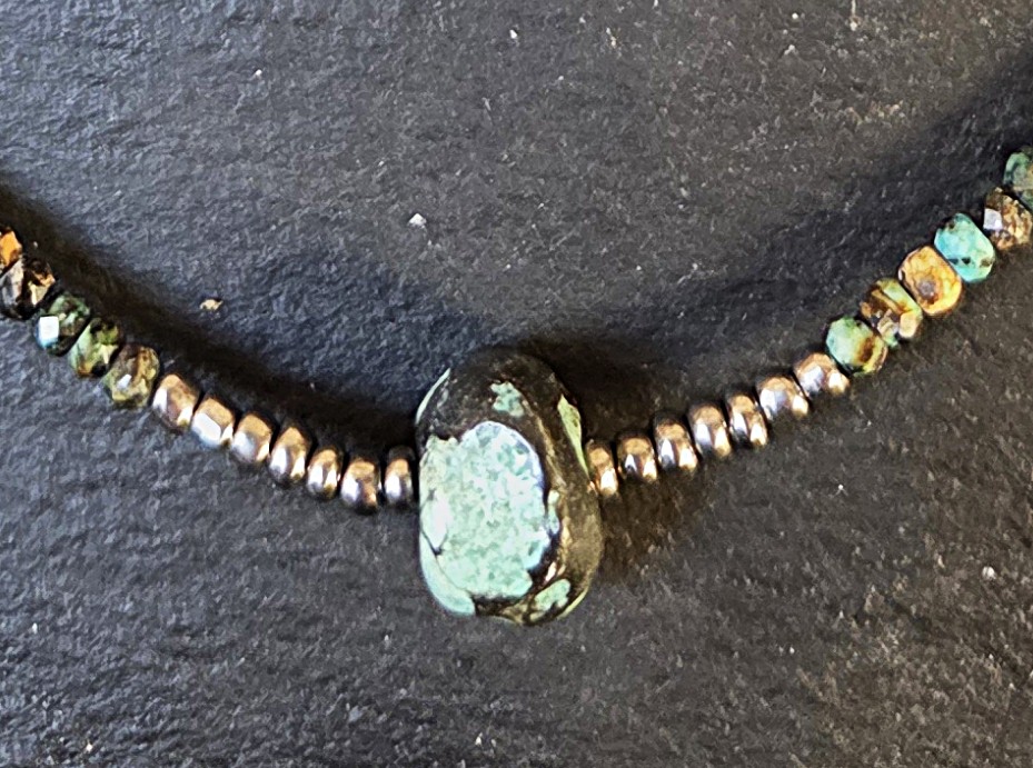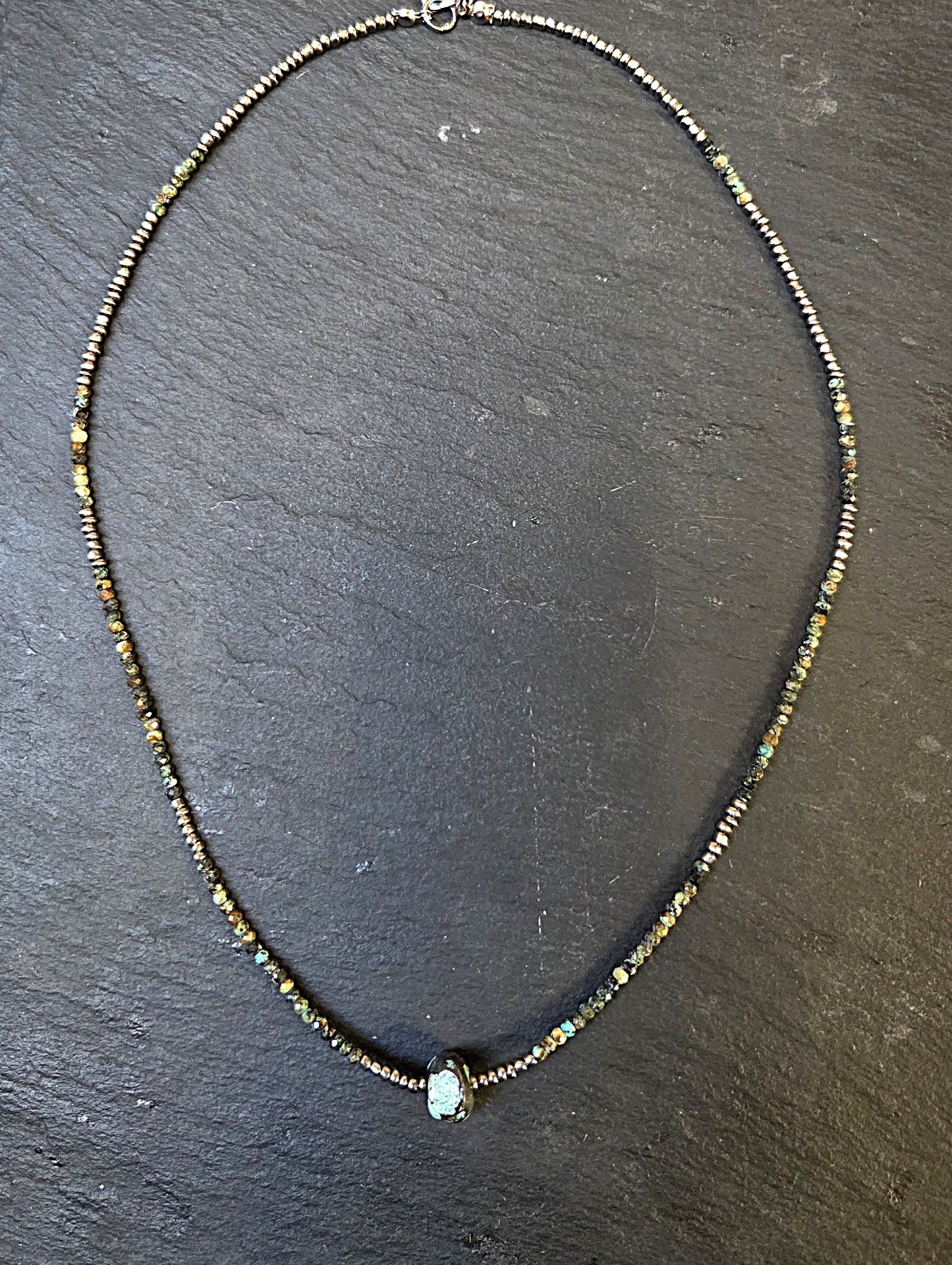 Unisex egyedi nyaklánc, központi türkiz kő, apró fazettált türkiz gyöngyökkel és fémes kásagyöngyel fűzve.