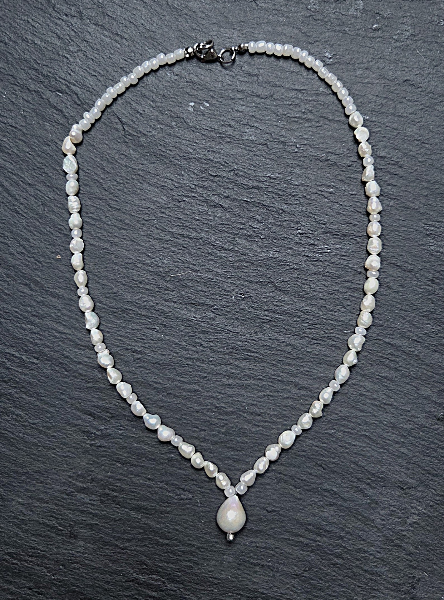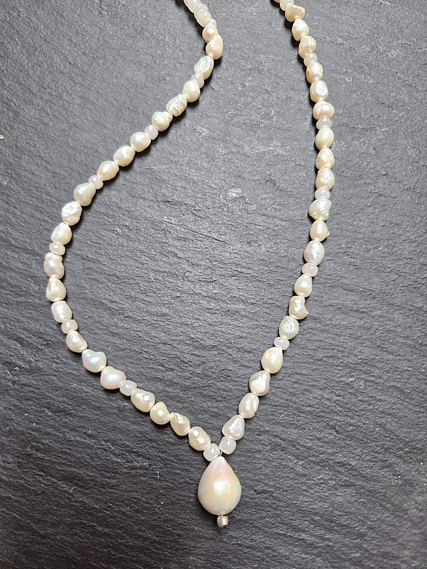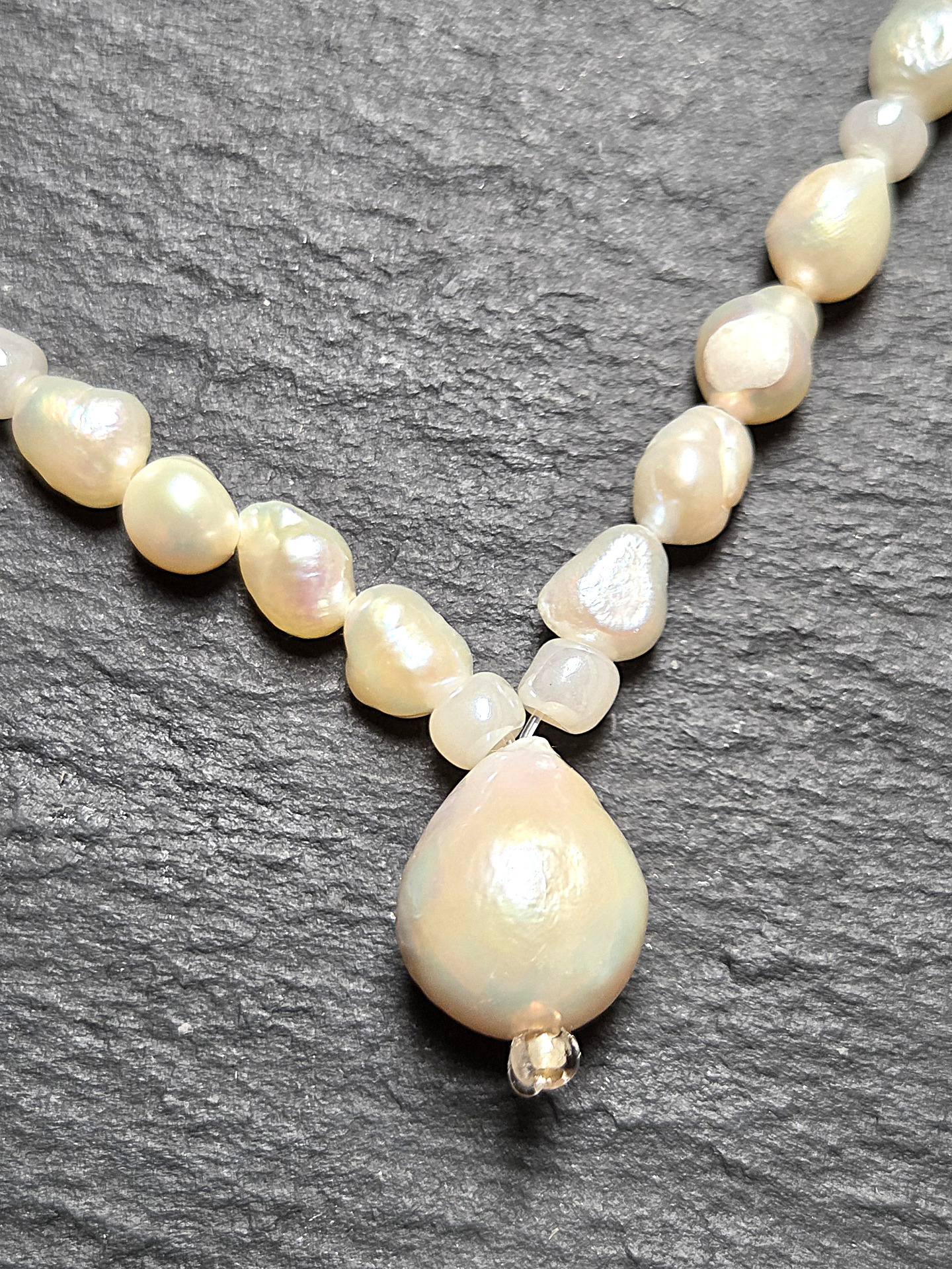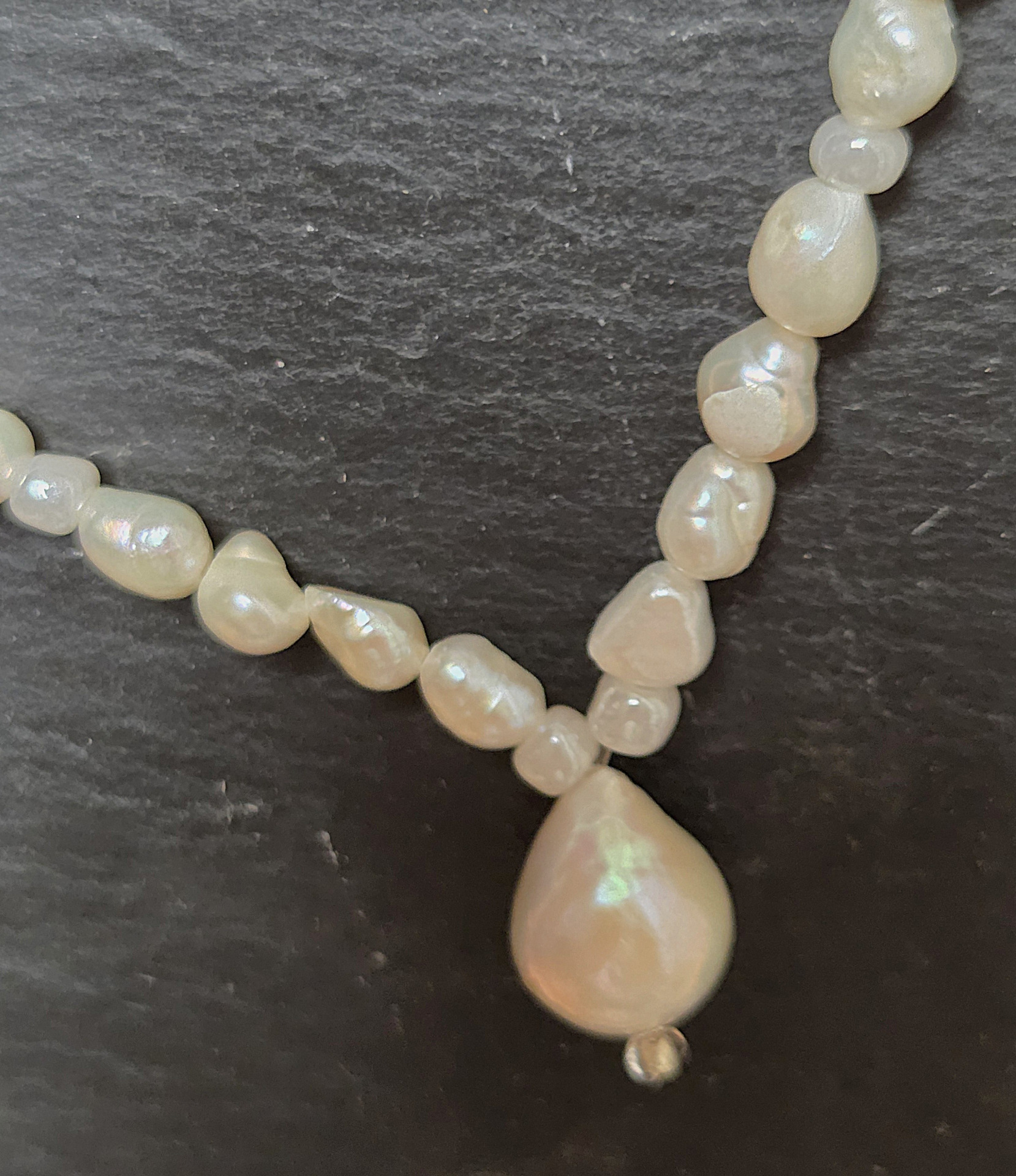Gyönyörű selymes fényű, valódi édesvízi tenyésztett amorf gyöngysor, domináns barokk gyöngyel ( 12mm) és apró kásagyöngyel. Hossza 46cm.